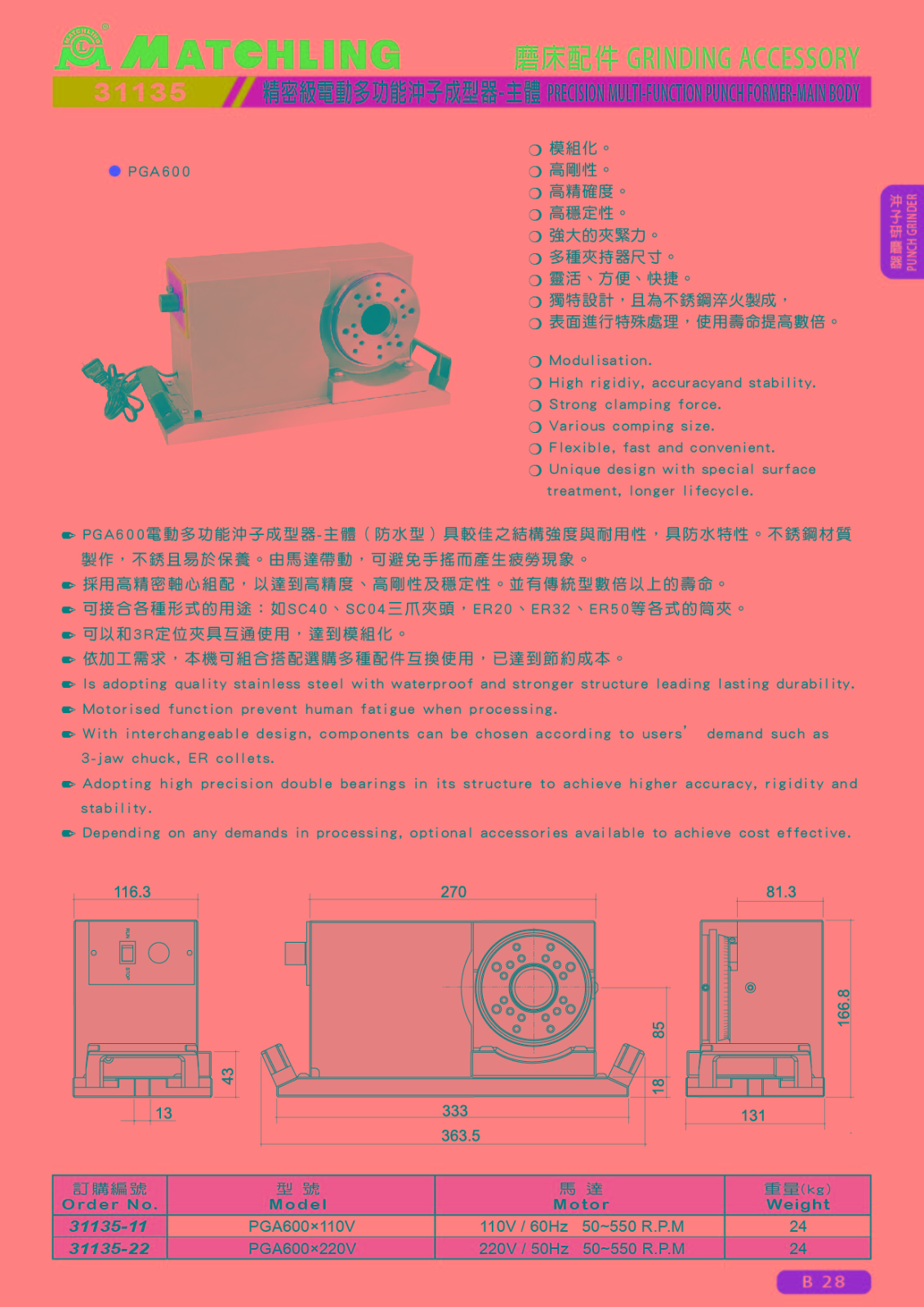 ● PGA600電動(dòng)多功能沖子成型器-主體(防水型)具較佳之結(jié)構(gòu)強(qiáng)度與耐用性,具防水特性。不銹鋼材質(zhì)製作,不銹且易於保養(yǎng)。由馬達(dá)帶動(dòng),可避免手搖而產(chǎn)生疲勞現(xiàn)象。