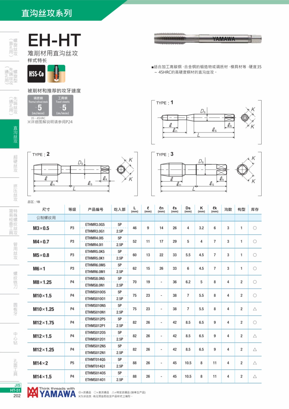 * 適合加工高碳鋼、合金鋼的鍛造物或調(diào)質(zhì)材、磨具材等,硬度HRC34-45的高硬度鋼材的直溝絲攻。